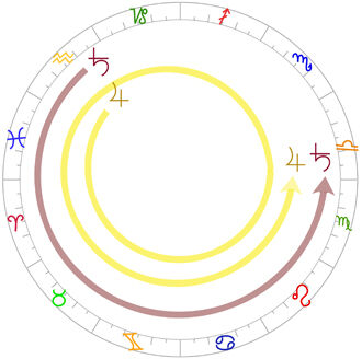 ということで、常に20年後、240度先となると、ずっと同じエレメントで、木星♃と土星♄は重なり続けるわけなんですよ。