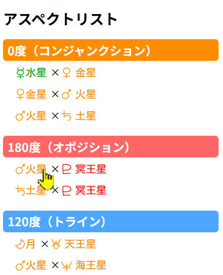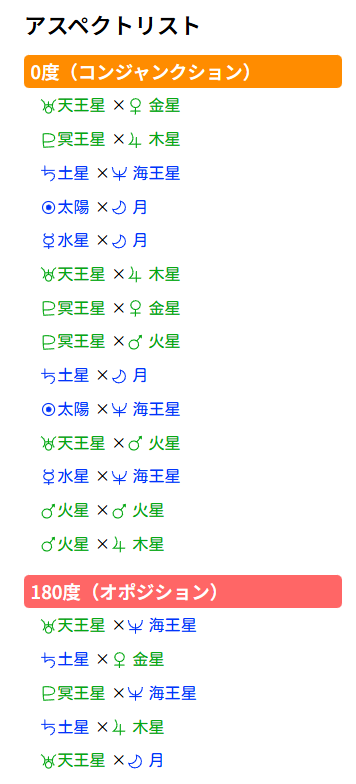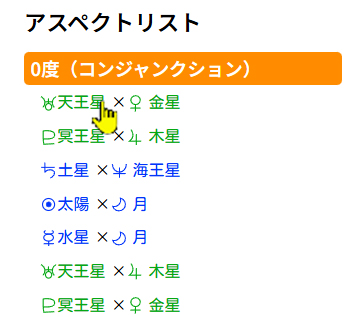 アスペクトの他に、○星×星座 のリストも同じように出てきます。