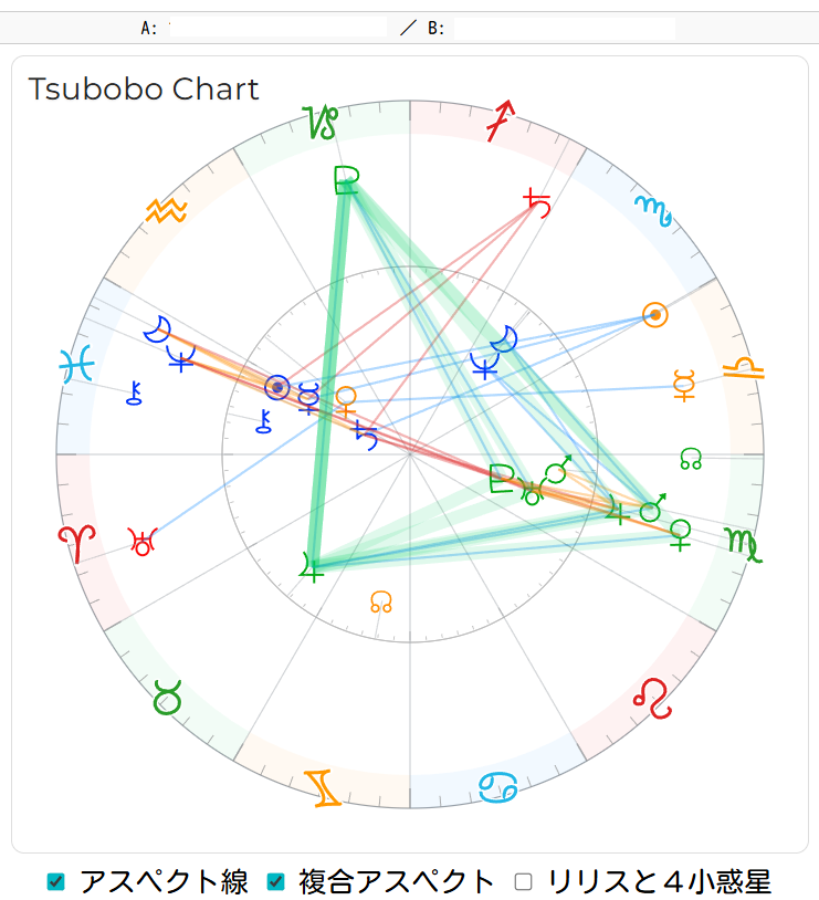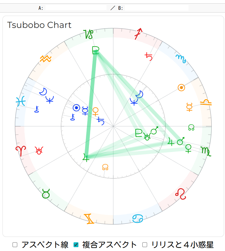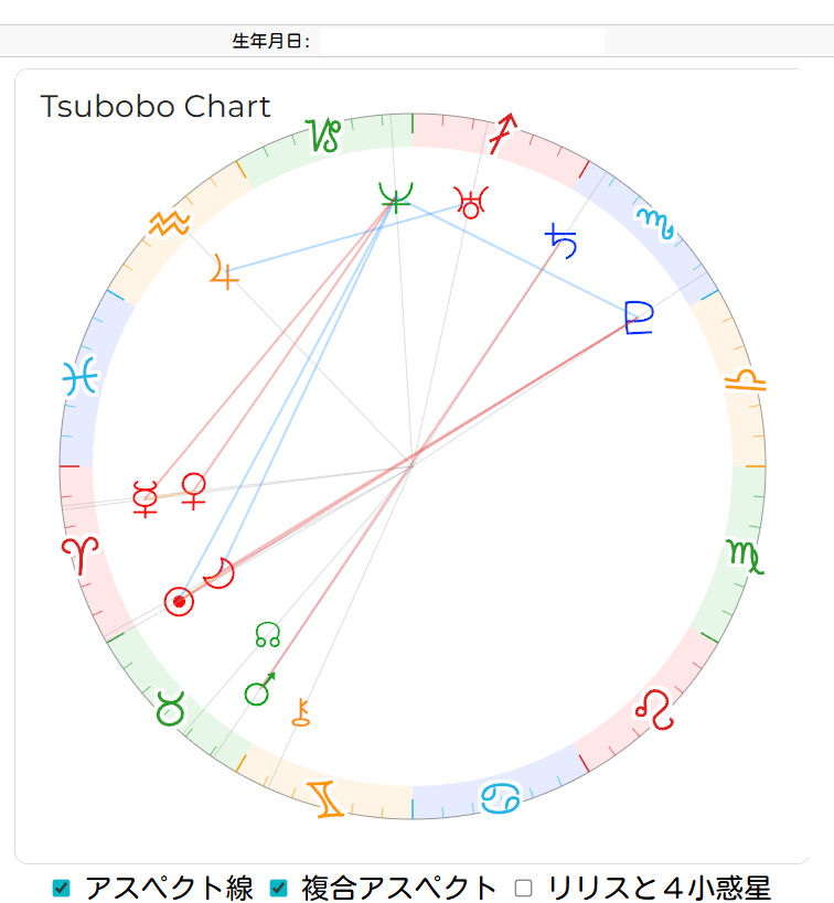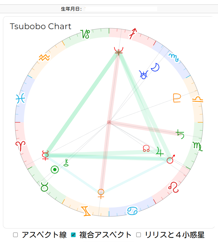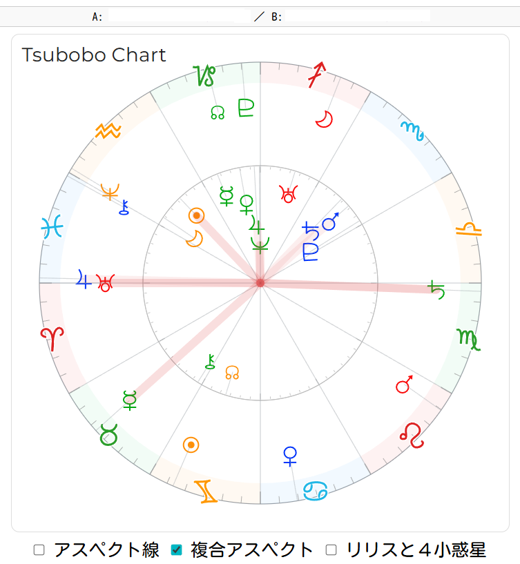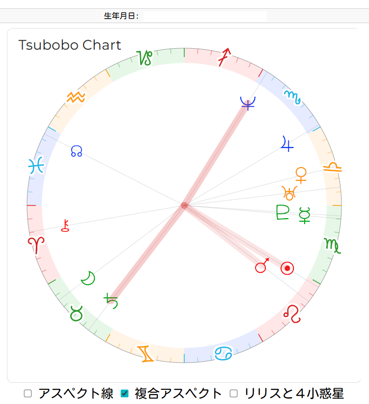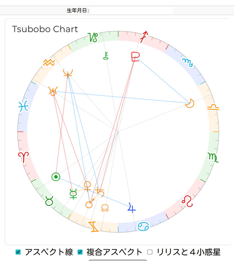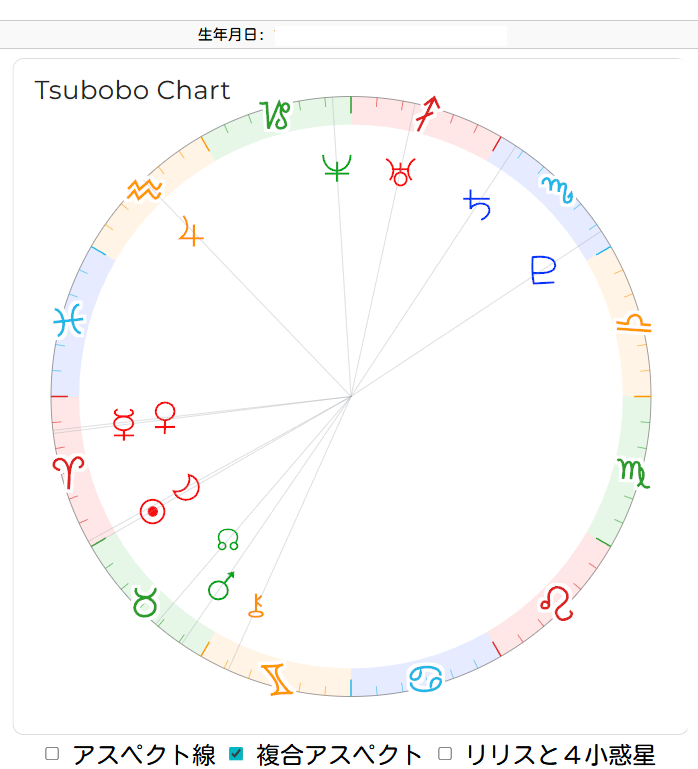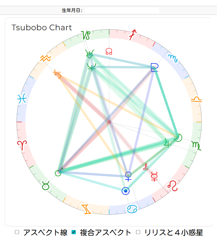 で、そんな時は、とりあえず、チャート下の「複合アスペクト」のチェックボタンをクリック、またはタップをして下さい。
