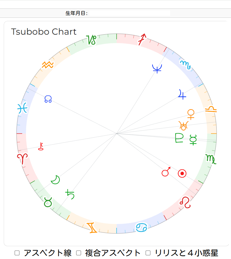 まぁ、生年月日は適当ですが、以下のようなチャートが出てきます。(生年月日は加工して隠してあります。)