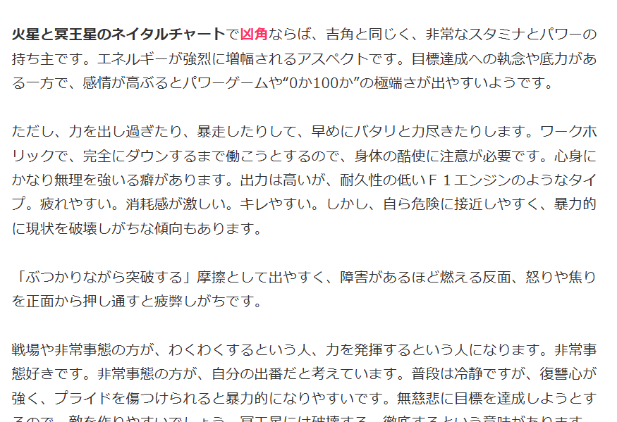 このような強い凶角を持っている人間は、ガツガツしたところがあり、気難しさもあったりします。強く刺激を求めます。もし、自分の子供にTスクエアがあったら、ちょっと育てにくい子かもしれません。ちょっと付き合いにくいところもある。そんな感じです。アクが強い人間です。