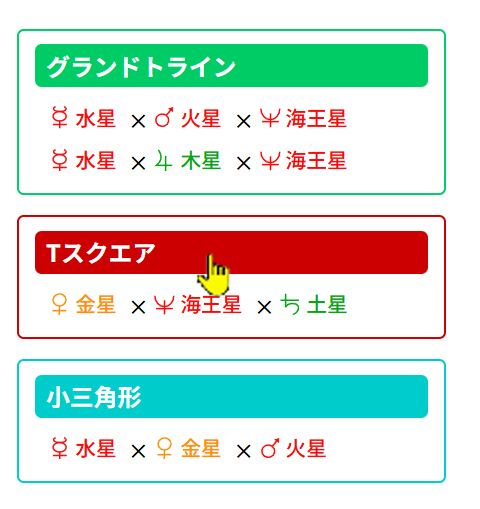 例えば、Tスクエアの場合は、3つの星で構成されていますので、「○星×○星」と言う組み合わせは3つできます。その3つのアスペクトを読むと良いでしょう。