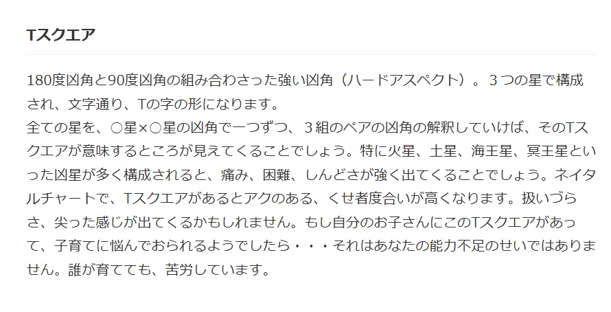 さて、ネイタルチャートの場合、チャートの下にいろんな複合アスペクトが表示されます。その複合アスペクトの意味が知りたい場合は、その「Tスクエア」などの名前の部分をクリック、タップしてもらえれば、その解説ページにリンクしています。