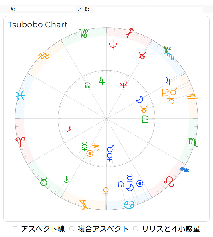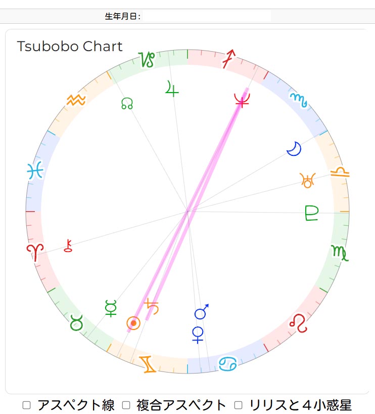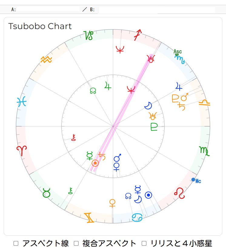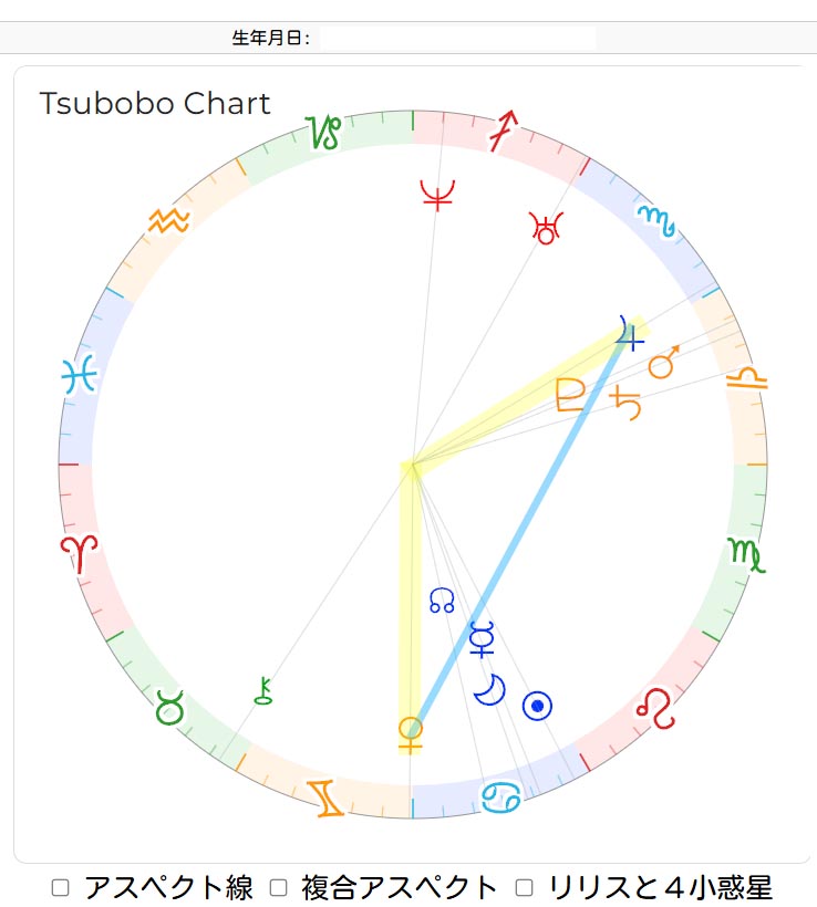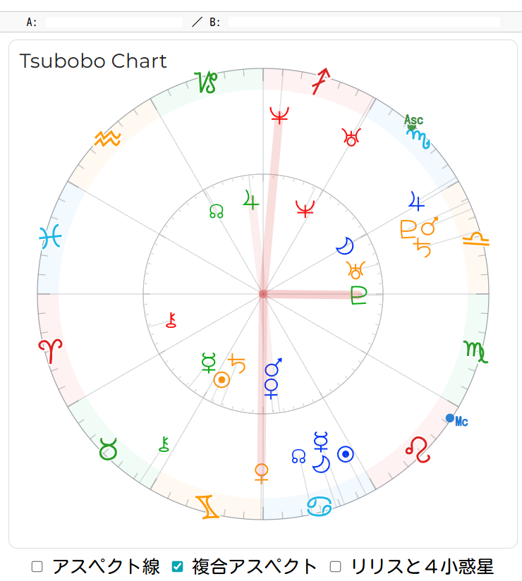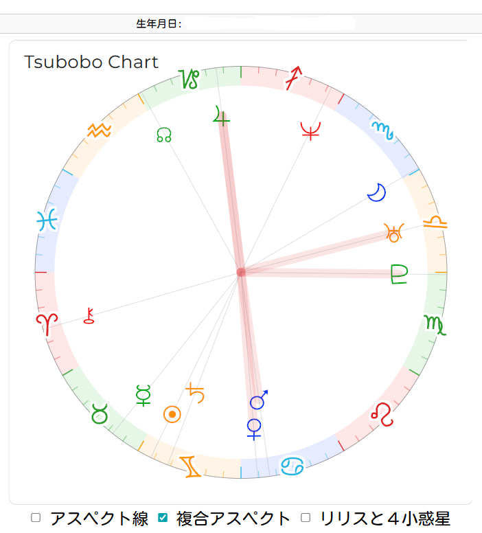 このチャートの「複合アスペクト」のボタンをチェックして、表示しますと